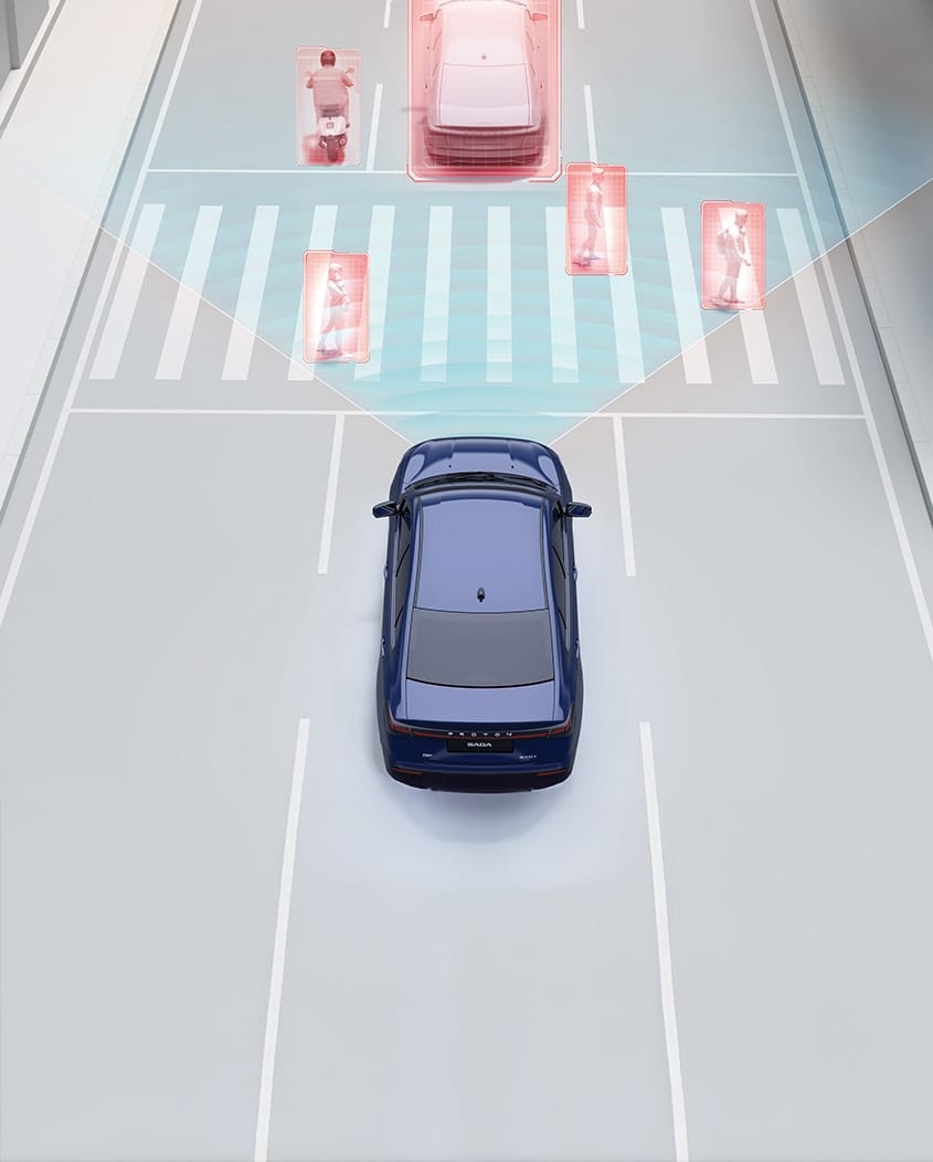Equipped with Autonomous Emergency Braking (AEB), Forward Collision Warning (FCW), Front Departure Alert (FDA), Lane Departure Warning (LDW), Lane Change Assist (LCA), Rear Collision Warning (RCW), Rear Cross Traffic Alert (RCTA), and Door Opening Warning (DOW).